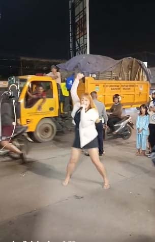 Tanpa rasa canggung, ia beraksi tepat di samping arus lalu lintas yang sedang padat merayap. Sambil memegang ponsel untuk live TikTok, Pinkan terus bergoyang meski mobil dan motor berlalu-lalang di sekelilingnya.